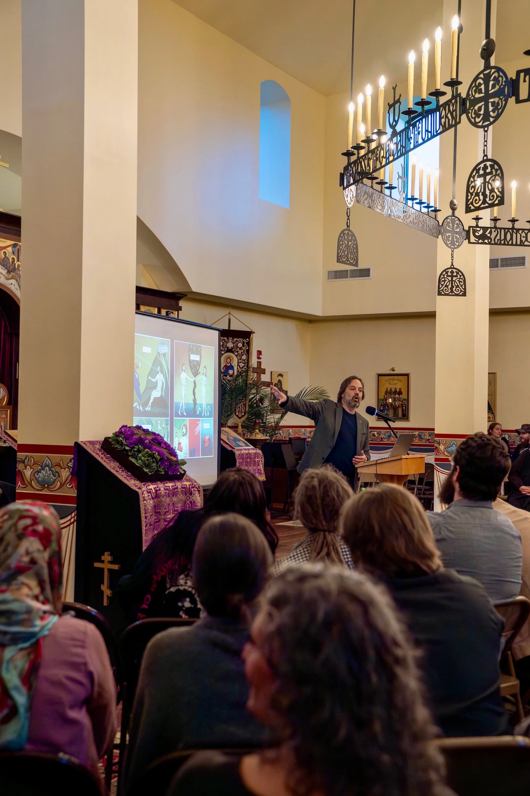 We hosted Jonathan Pageau last night for a very inspiring talk that got us all thinking. He discussed the importance of Christians engaging culture through creating the “art of the narthex” and how important it is that we produce art that points towards what is beautiful and true, towards the sacred, towards Christ Himself.